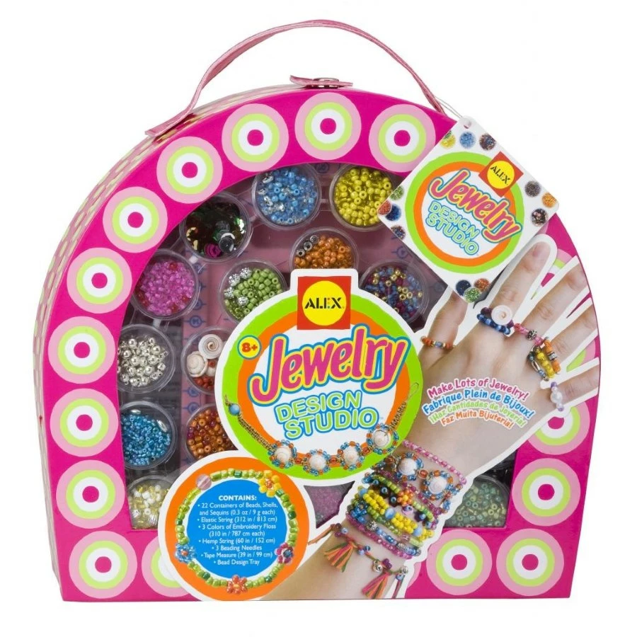 The Jewellery Design Studio by Alex Toys is the perfect craft kit for the do-it-yourself child who loves beading and creating jewellery from beads. Make personalised and custom jewellery wrist bracelets, a ring set and a necklace. Making a piece of custom jewellery from this kit set has never been easier with the included 2-page instruction manual. This craft kit set contains tons and tons of beads in 22 different colours and sizes, various coloured strings, and a tape measure. Also included in this kit are sequins, shells, elastic and beading needles. The bead design tray helps you design your jewellery, including markings that help you measure the jewellery piece’s length. Learn the art of macrame and have fun creating flowers, double loops and tassels. The carrying case makes it very convenient to take this craft kit anywhere you go. Suitable for ages 8 years and up.