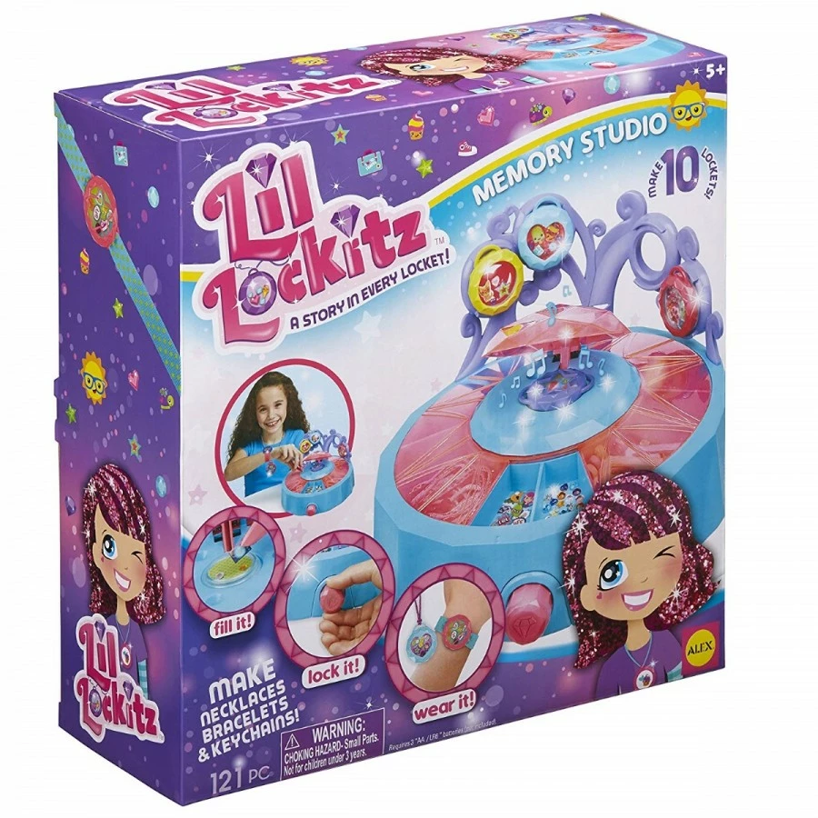 Alex Lil Lockitz Memory Studio ñ Here is a chance for the children to create something personal for themselves, their siblings, or their friends. Lil Lockitz Memory Studio kit comes with gems, charms, and backgrounds that float in a wearable collage. The kit has 11 covered compartments and there is enough space to store all of the charms and lockets. It is very simple to make a memory locket ñ just select a locket, fill it with the charms and colours of choice, and finally turn the knob to lock it. Music and lights give special effects to the locket and give it a charming look. This new creation can be worn as a bracelet, necklace, or keychain. There is space to store up to 4 created lockets when not being used. This kit includes 3 Memory Studio with locket display, 10 locket tops and backs, 30 gems, 3 keychain clasps, 16 backgrounds, 3 bracelets, 40 charms, 4 necklaces, photo stencil, tweezers, and a set of easy-to-follow instructions. The kit requires 3 AA batteries to work which need to be brought separately. The Memory Studio kit is recommended for children 5 years and above.