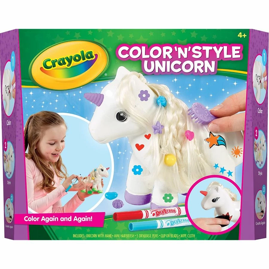 The Colour n Style Unicorn by Crayola is a great toy to help children personalize their toys and exercise creativity at play. This playset comes with a white unicorn with a beautiful white mane and small patterns on its body. The set also includes a hairbrush to comb the unicorn’s mane and clip-on beads to put on its mane. You also get 5 washable felt tip colouring pens of different colours and a piece of cloth to wipe away the patterns you created on the unicorn and create new ones. To play with it, children can use the felt tip pens to draw patterns and colours existing designs on the unicorn. It dries up in seconds, and children can play with their personalized unicorn. When they want to change the pattern, they can use the piece of cloth to erase the design and create new ones. There are endless possibilities of creating modern art of the unicorn. Children can stay busy for a long time playing and glamming up their unicorn. It is 12cm high and 13cm long. The playset is recommended for children over 4 years old.