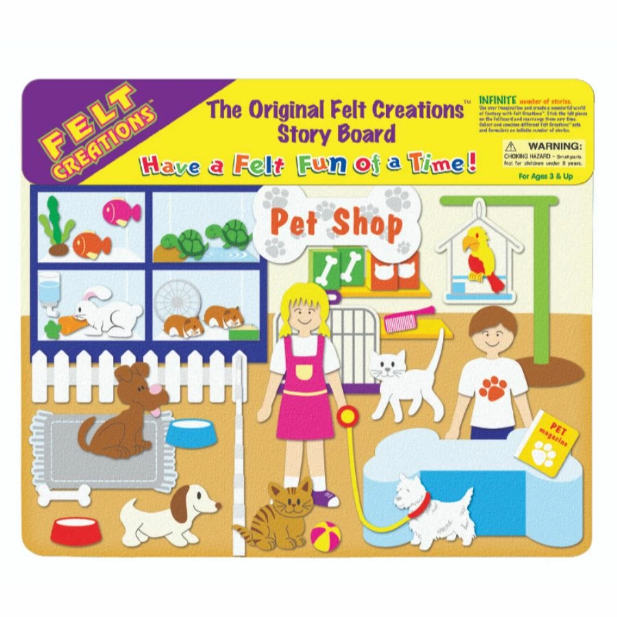 This is a storyboard kit for your young child to express their creativity and use for imaginative role-play or storytelling. The Felt Creations Pet Shop is based on the happenings and activities that you can see in a day at the pet shop. The felt storyboard has images of a pet shop as the background. This playset also included the pre-cut felt in the shapes of animals in a pet shop such as dogs, cats, tortoise, a parrot, a pair of hamsters, a rabbit and a pair of fish in many different colours. Your child can use these animals and place them onto the storyboard while using their imagination to create a storyline. After the story is completed, the felt pieces can be removed and is ready to be reused to imagine a different story. Have hours of fun by creating and telling many different pet stories. Suitable for ages 3 and above.