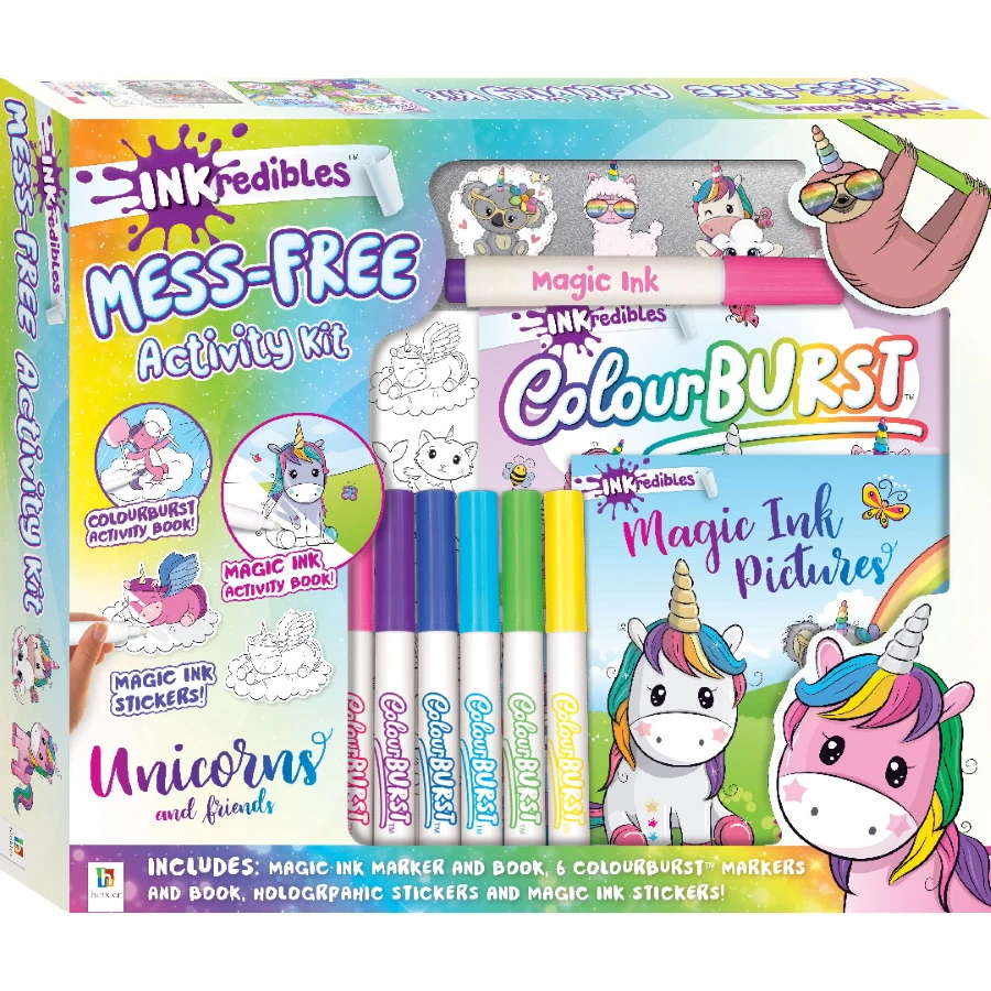 Children love doing colouring activities; they provide learning benefits for children to engage in as colouring helps develop the fine motor skills of grasping and handling. Although a simple task, it helps with eye to hand coordination. The discipline required to colour within a set boundary will be beneficial in the development of young children. This Inkredibles Unicorns & Friends Activity Kit is a complete colouring activity for your young child. Included are 6 ColourBurst markers; pink, purple, dark blue, light blue, green and yellow; a mess-free 16-page colouring book with pre-printed images; 1 Magic Ink marker; 24-page magic ink colouring activity book; magic ink stickers which work with the Magic Ink Pen; and holographic stickers. The awesome Inkredible technology allows the pens to make a magical rainbow on the page while staying off everything else and is mess-free. Suitable for ages 4 and above.