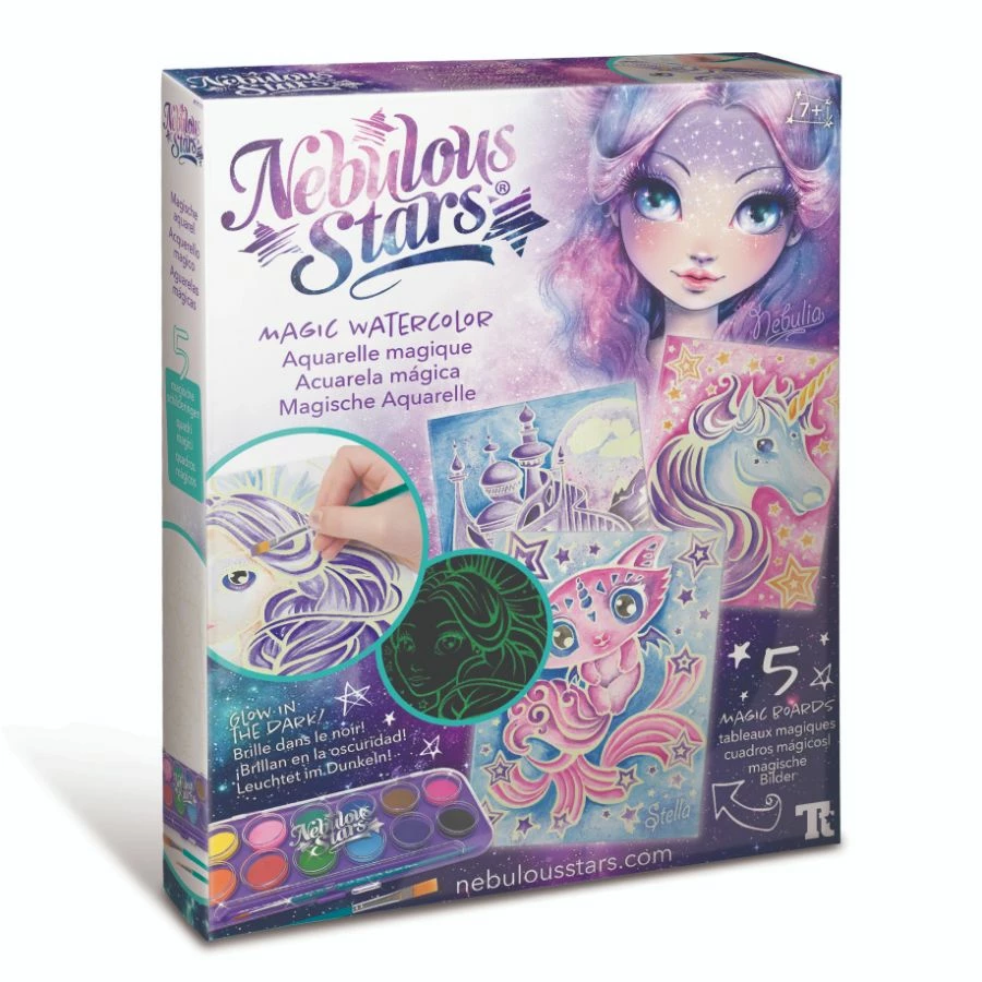 Nebulia lives in a magical place where the stars shine all day. She has a pet named Stella, and they are best friends. This set is an excellent way for you to express your creativity. The package contains a palette of 12 watercolours, 2 brushes, and 5 pre-lined artboards. The lines are varnished so the colours won’t smudge where you don’t want them. Each artboard has a unique illustration. The first art design is a photo of Nebulia with her neatly styled magical flowing hair and the next image is a smiling Stella surrounded by many stars. Another picture of Stella is on the next board. Stella sits on the moon while she watches the stars. Following image is Nebulia’s home. The last illustration is a magical unicorn also surrounded by stars. There are no rules on how to paint the pictures. Use your imagination and creativity. You can use any colour combination. Just dip your brush in water, rub it on the paint, and start painting the board. This set is recommended for young artists aged 7+.