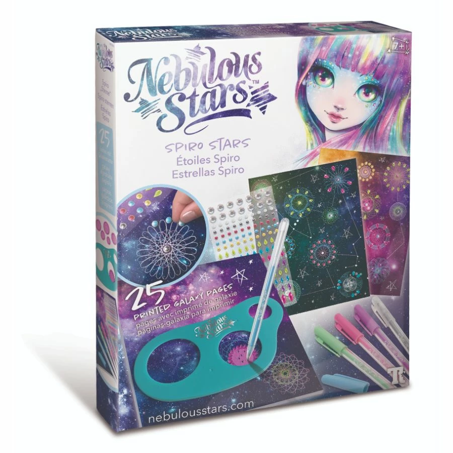 Learn about astrology and become a part of creating a brighter and more colourful universe with this new Nebulous Stars Spiro Stars. Choose one of the mystical galaxy pages provided, and then select a wheel, place it in the spirograph and use one of the gel ink pens to swirl and create your planet. Then decorate it with the self-adhesive brightly coloured diamonds and pearls to make it extra shiny so you can see it from the earth. The pack includes 1 blue spirograph base, 7 pink different sized stencil wheels, 25 printed galaxy pages, 20 galaxy pages for you to print, self-adhesive multi-coloured and sparkling decorations and 5 metallic gel ink pens in blue, green, pink, purple and white. Also included is an instruction booklet and Isadora’s story which talks about home, friend, creativity, love, body and mind. Creative play at its best while sprucing up your drawing skills at the same time. Recommended for ages 7 and over. Batteries are not required.
