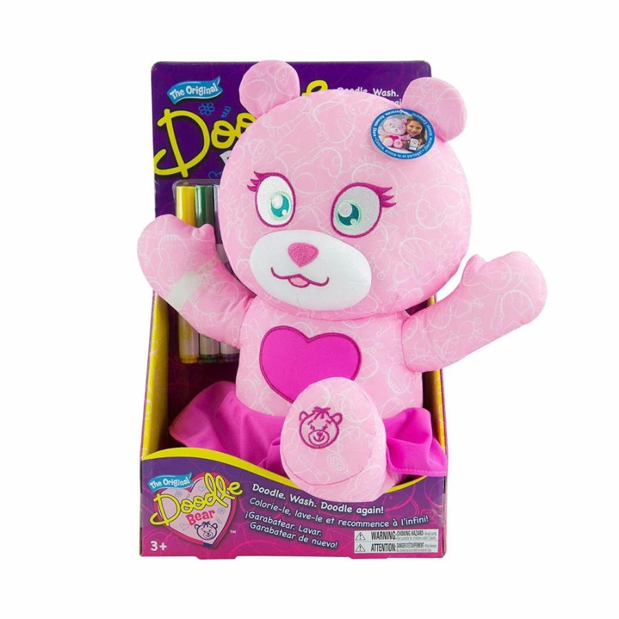 This adorable pink Doodle Bear will capture your heart from the first moment you set eyes on her. She is super cuddly, dressed in different shades of pink, with gorgeous eyes that look at you with love and affection. Her arms are spread out waiting for you to pick her up and give her a snug cuddle. She has a big heart and a lot of love to offer you. But that’s not all. You will find three colourful, washable markers in the box which you can use to draw and doodle anything you like. When there is no more room just put her in the washing machine for a quick wash and then you can start doodling all over again. But wait, there is also another fantastic feature. Download the specified app on your phone, take a picture with your phone and then customise the background, record a message and show your friends and family your beautiful creation. Recommended for ages 3 and over. Batteries are not required.