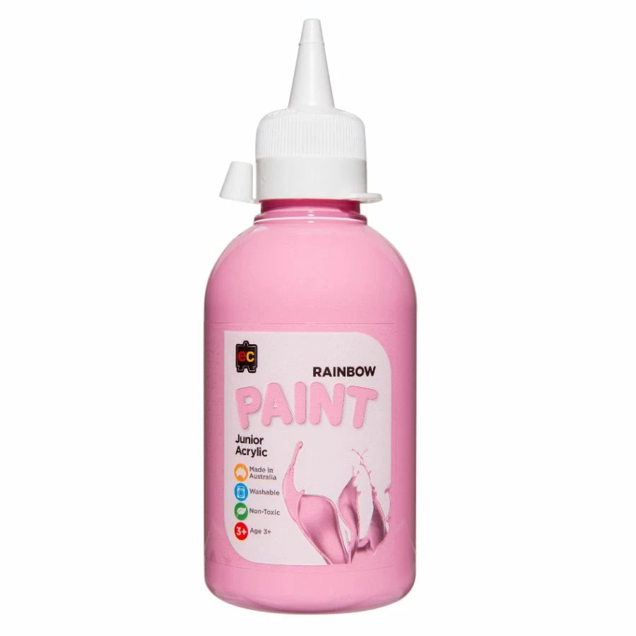This pink paint by Rainbow Junior is water-based acrylic paint. The ready-mixed paint is one of the 17 colours in which the Rainbow Junior Paints are available. The bottle is plastic with a cap that allows children to easily pour the paint directly on the surface where they want to paint or on a palette. A stopper for the lid is also included so that the colour does not dry out. The bottle holds approximately 250ml of paint. Made in Australia, the colour is non-toxic and washable, making it easy for parents to get the paint off from childrenís hands once they are done painting. Since it is non-toxic, the paint is safe even when small kids use it to paint with their fingers. Children can stay busy for a period trying to explore and hone their creative abilities as they paint. It can help them improve their gross and fine motor skills, along with hand-eye coordination as well. This paint is recommended for children over 3 years old.