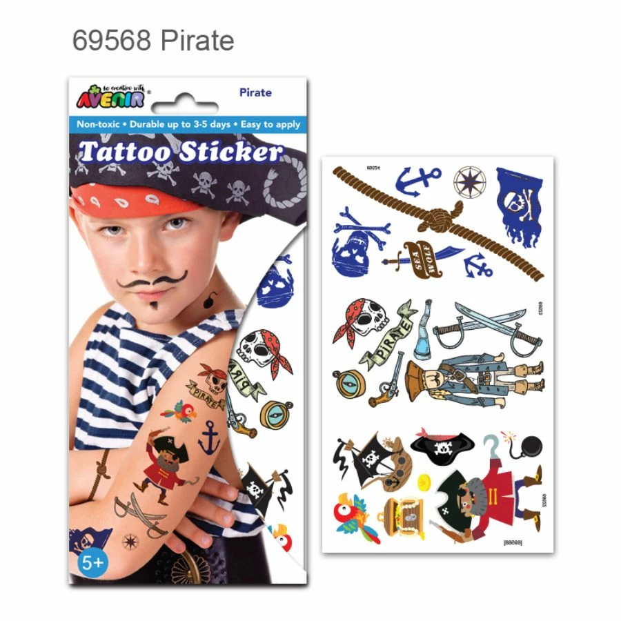 Yarrr! Level up your pirate role-playing game with Avenir Tattoo Stickers. Wear your striped pirate shirt paired with your cool pirate trousers and red handkerchief on your head. Complete your look with an anchor or skull tattoo on both arms. Or maybe you want a tattoo that says “Pirate”? Tell the captain of the ship to get ready and get dressed for battle. Another ship is approaching, and the crew is not looking friendly. Get the captain’s red waistcoat, black hat, and sword. Complete the captain’s look with a tattoo featuring swords, bombs, compass, or a pirate captain illustration. Every crew member will look more impressive with a pirate-themed tattoo, so make sure everybody gets one. Get everyone ready and yell, “Aye, captain!” Avenir Tattoo Stickers are easy to apply. This item is recommended for kids aged 5+ years and made with non-toxic materials. When applied, tattoos last for up to 3-5 days. Which pirate are you going to be? Jack Sparrow or Captain Hook?