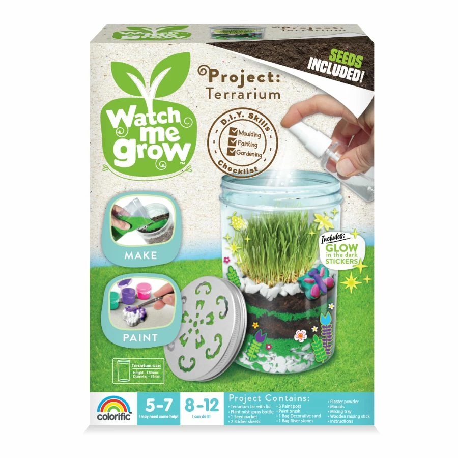 Create your Terrarium Jar! This Watch Me Grow kit allows you to experiment with gardening’s pleasure and inventiveness. Plant and maintain your terrarium according to the instructions. Use the accompanying glow in the dark stickers and plaster moulds to decorate your jar. Colorific’s Watch Me Grow collection will help you sow the seeds of creativity. Each kit includes seeds and supplies to let you create your pot plant. Learn about plants while expanding your STEAM skills! Give your children skills that they will be able to use for the rest of their lives for work or play. The Terrarium Jar proves that science and learning can be very fun for children of all ages.